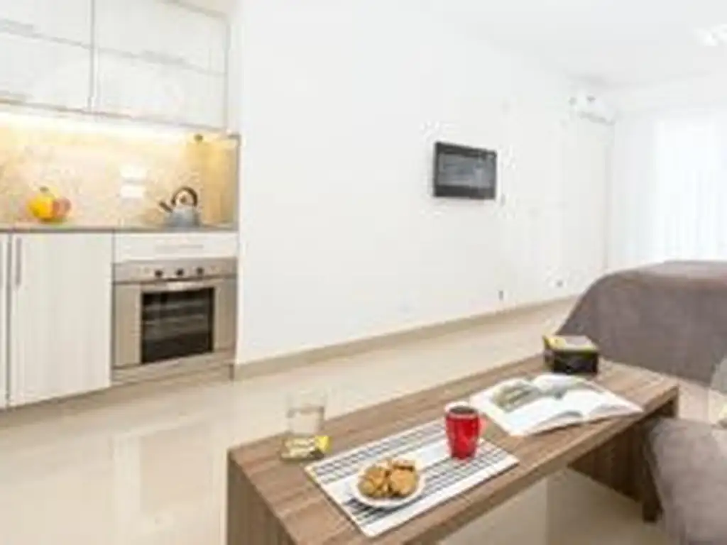 Cocina kichenit, horno y anafe eléctrico de muy buena calidad, Heladera con freezer, dos sofá de un cuerpo con mesa ratona, un escritorio, aire frió calor, baño completo, elementos básico en vajilla. Cama de dos plazas y un armario acorde al dpto. Ropa blanca.