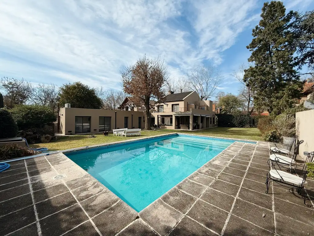 Descripción: Se accede por un doble ingreso, tanto vehicular como peatonal, que conduce a un amplio hall de recepción. Desde allí se integra un luminoso living-comedor con grandes ventanales hacia el jardín, un toilette de cortesía y un escritorio o dormitorio con conexión directa a la cocina. La cocina se encuentra totalmente equipada con alacenas, bajo mesada, mesada de granito, horno y campana, y se complementa con un comedor diario. En esta planta también se ubican un lavadero independiente, un quincho cerrado con baño completo y una galería cubierta de generosas dimensiones que conecta con el parque. El sector exterior dispone de parrillero, cuarto de guardado, sala de máquinas, un extenso jardín parquizado y piscina con solárium.
