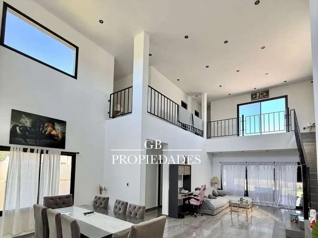 Planta Baja: Al ingresar, encontramos un amplio living-comedor en doble altura con hogar a gas. Cocina semi integrada con desayunador y el área de servicio con entrada independiente. Toilette. Dormitorio en suite con vestidor completo, ante baño y baño completo.