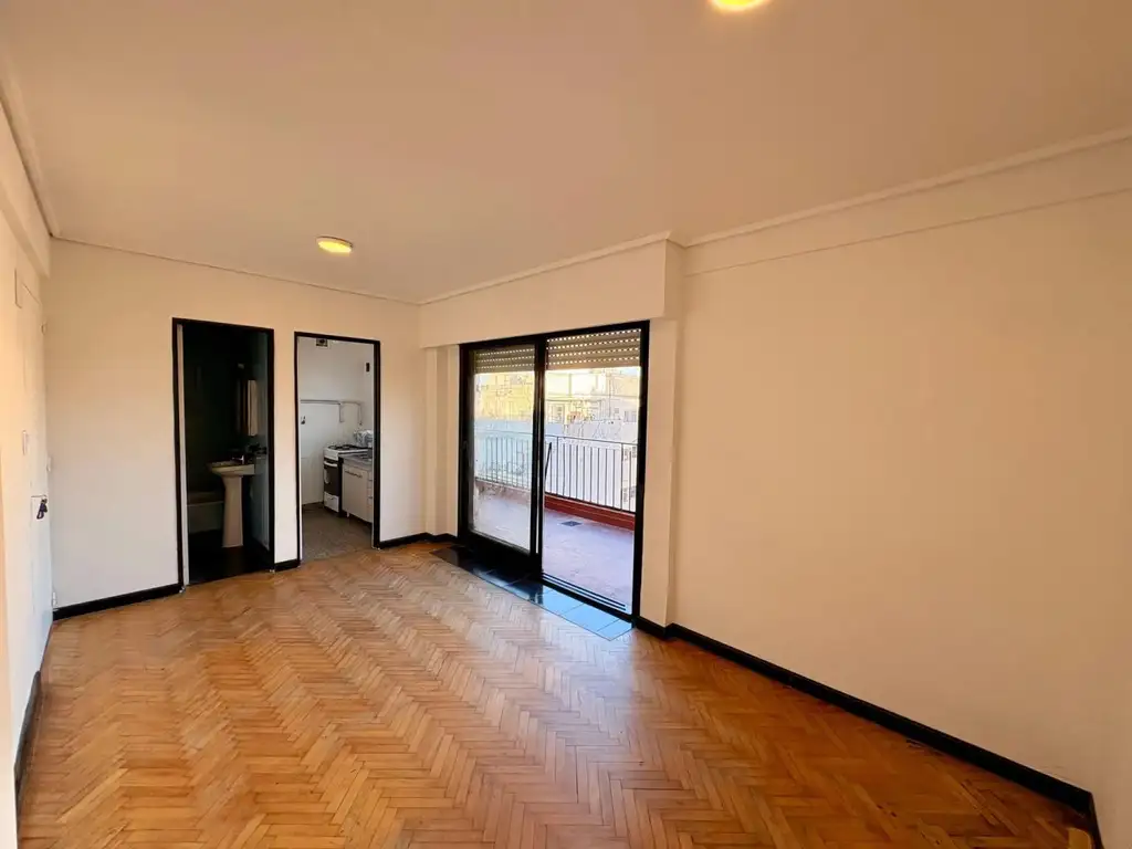 Muy luminoso y con mucho potencial. Pequeña cocina separada a gas natural, baño completo. Balcón-terraza muy amplio y con muy buena vista , ningún edificio enfrente.