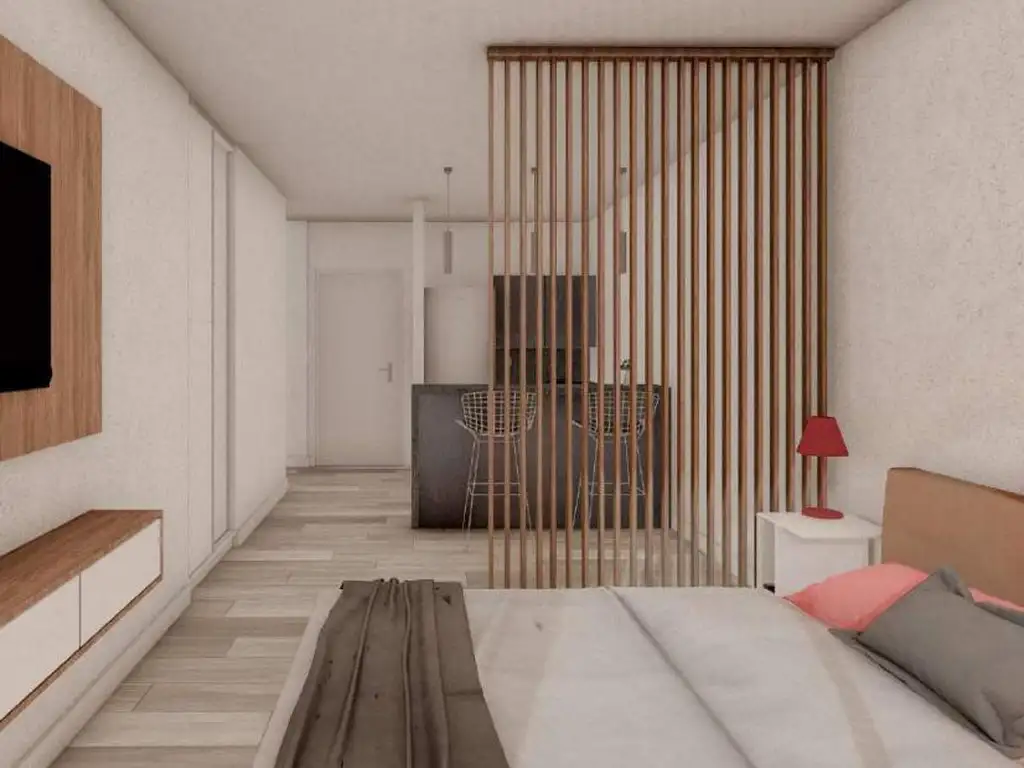 Monoambiente moderno y bien aprovechado, con una distribución que permite organizar cómodamente el espacio de estar, descanso y comedor. La cocina integrada presenta un diseño contemporáneo y funcional, ideal para el uso diario.