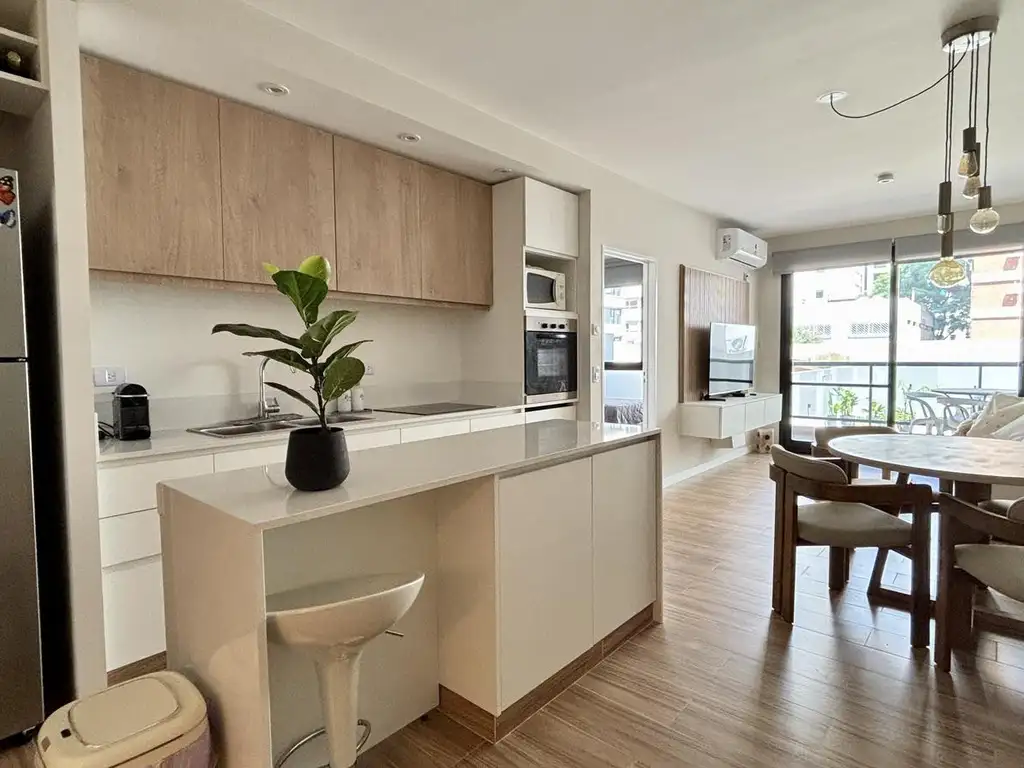 Cocina integrada con isla doble, mesadas de silestone, horno empotrado eléctrico y anafe, se integra de forma funcional al espacioso living-comedor, generando un ambiente moderno, ideal para disfrutar y compartir con visitas.