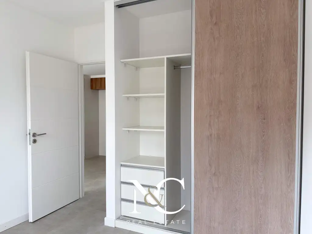 - Las unidades poseen placard con frente integral de melanina color a tono con los muebles de cocina, y el interior completo con cajoneras, estantes y barrales.