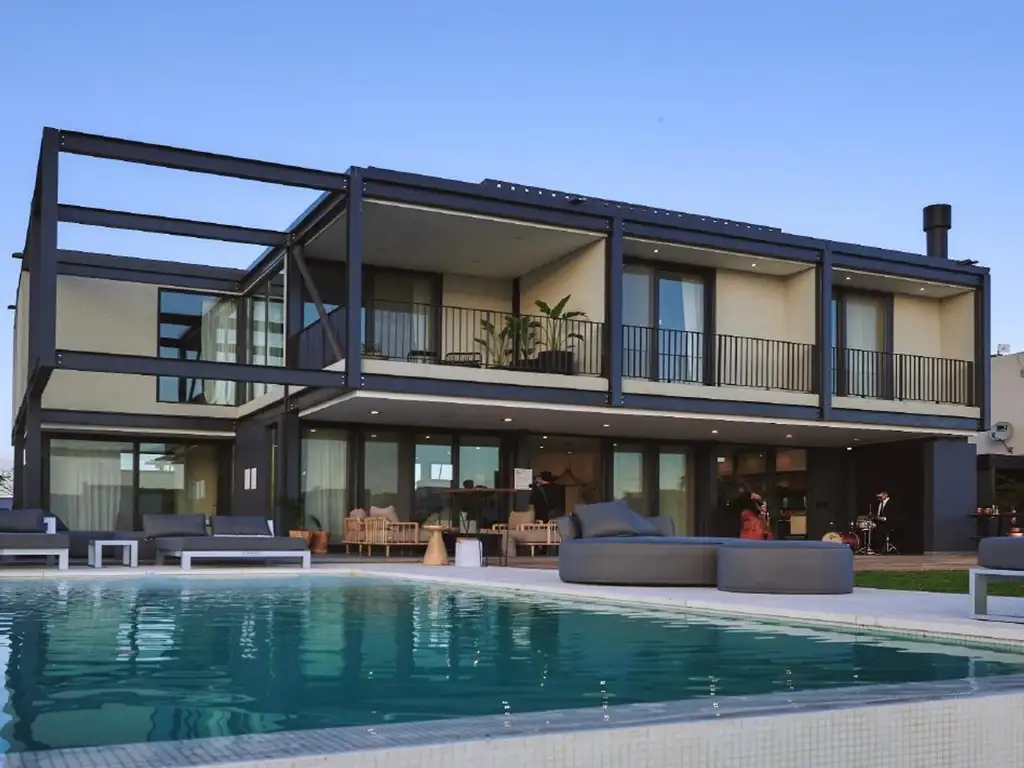 Casa en venta, a estrenar, amoblada, a la laguna, con pileta, en el barrio Acacias, Puertos, Escobar, Bs. As. Cuenta con una robusta estructura de acero, con grandes ventanales y cerramientos opacos de sistema de steel frame. Casa de 314 m2 totales, en 2 plantas y en un lote de 1.050 m2 en esquina, al lago con orientación Norte.