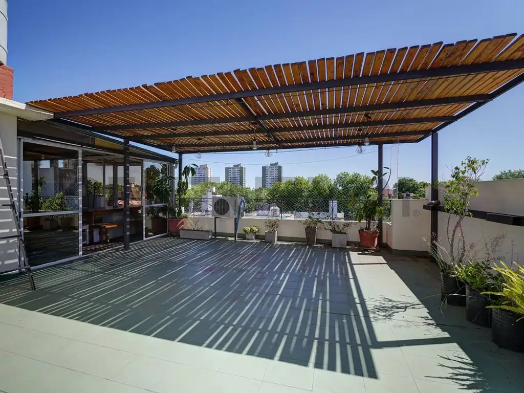 Desde el descanso de la escalera accedemos a la terraza privada, donde también se encuentra el termotanque. La propiedad ofrece un espectacular espacio descubierto de 42 m², ideal para disfrutar al aire libre, con parrilla y quincho cubierto con sector de lavadero (instalación para lavarropas).