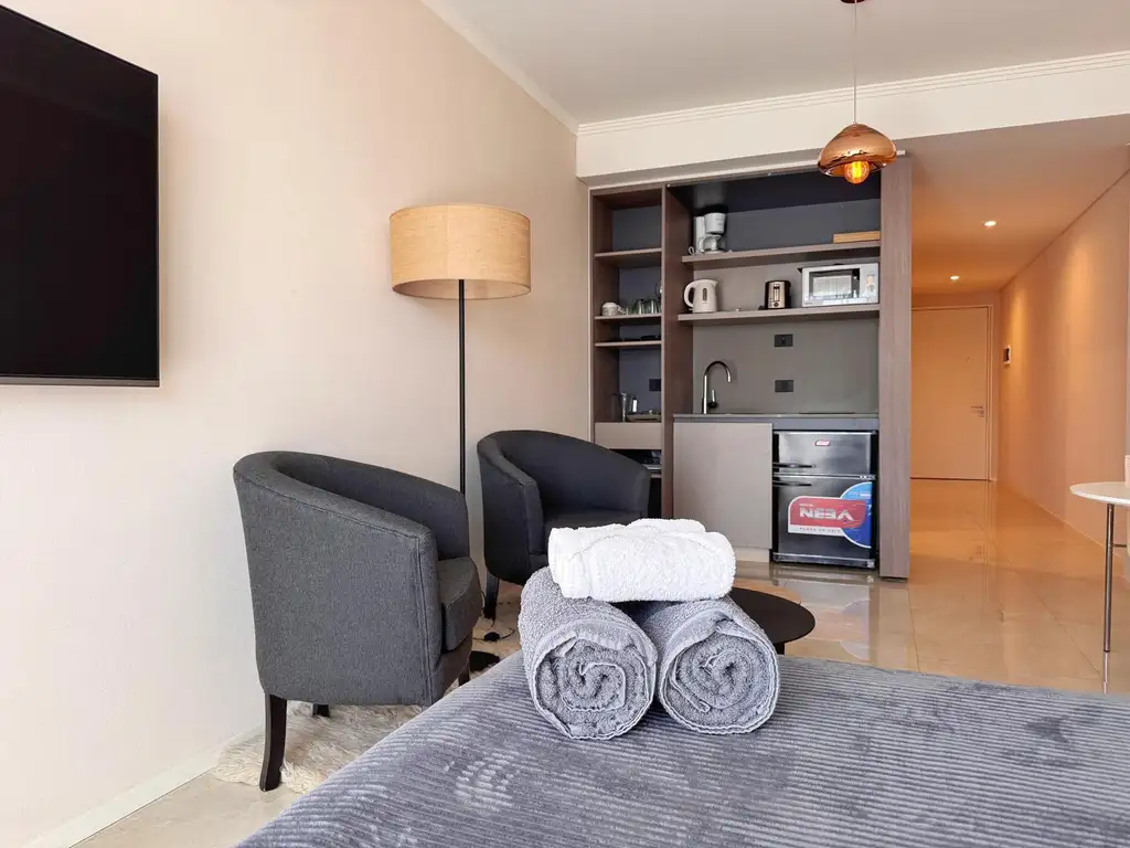 El espacio cuenta con una cocina integrada equipada con vajilla completa, anafe vitrocerámico, microondas, tostadora, pava eléctrica, cafetera y heladera bajo mesada tipo frigobar. La habitación está amueblada con una cómoda cama de 1,40 x 2 metros, aire acondicionado frío/calor y un balcón con vista al frente sobre la calle Guido, equipado con black out. El baño es completo, con ducha y vestidor con revestimientos y accesorios de lujo.