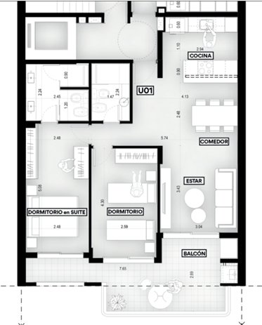 La unidad 01-01 posee 2 dormitorios con balcón al frente, Total 88,64 m2.