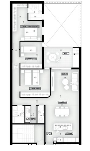 La unidad 02-02 posee 3 dormitorios con balcon, Total 117,01 m2.