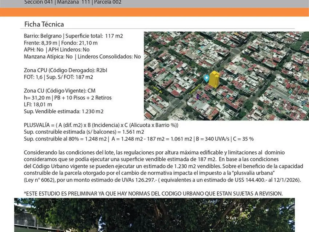 Considerando las condiciones del lote, las regulaciones por altura máxima edificable y limitaciones al dominio consideramos que se podía ejecutar una superficie vendible estimada de 187 m2. En base a las condiciones del Código Urbano vigente se pueden ejecutar un estimado de 1.230 m2 vendibles. Sobre el beneficio de la capacidad construible de la parcela otorgado por el cambio de normativa impacta el impuesto a la plusvalia urbana (Ley n 6062), por un monto estimado de UVAs 126.297.- ( equivalentes a un estimado de U$S 144.400.- al 12/1/2026).