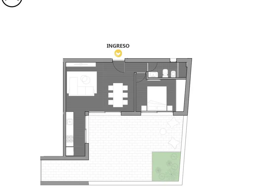 Departamento 1 dormitorio con estar comedor amplio saliendo a patio exclusivo al contra frente. Cocina semi integrada con luminoso ventanal al solado. Dormitorio con placard asistido por baño completo.