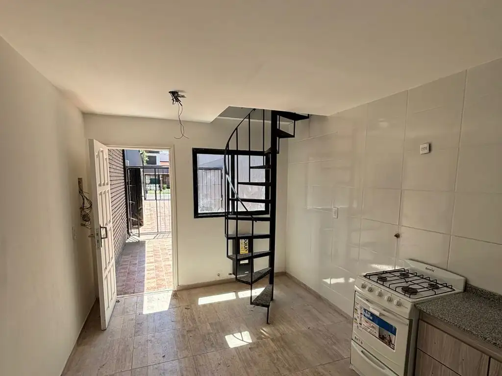 Posee living comedor con cocina integrada, baño completo, patio y dormitorio en planta alta.