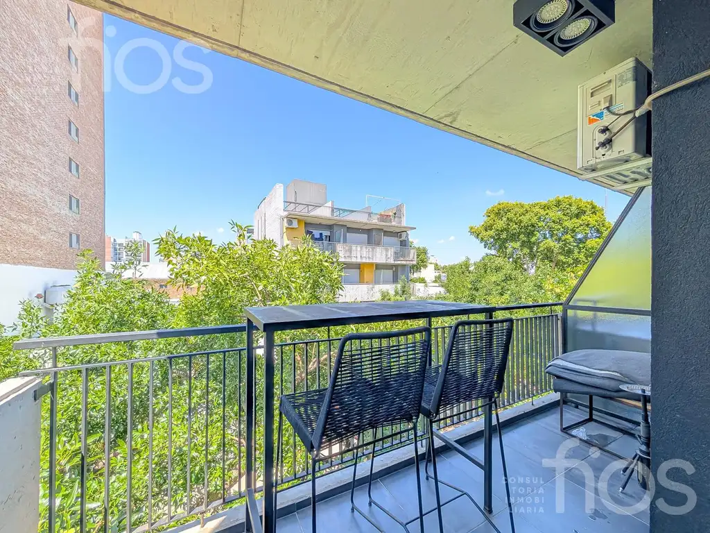 La unidad se desarrolla con una distribución cómoda, funcional y luminosa. El estar comedor integra la cocina en un ambiente moderno y práctico, con amoblamiento completo, mesada de granito negro Brasil, bacha de acero inoxidable, grifería FV, cocina y calefón a gas. Desde el espacio principal se accede al balcón al frente, aportando ventilación y luz natural durante todo el día. El baño es completo, con ventilación natural y artefactos de primera línea, mientras que el dormitorio ofrece buenas dimensiones, placard y piso flotante, logrando un ambiente cálido y confortable.