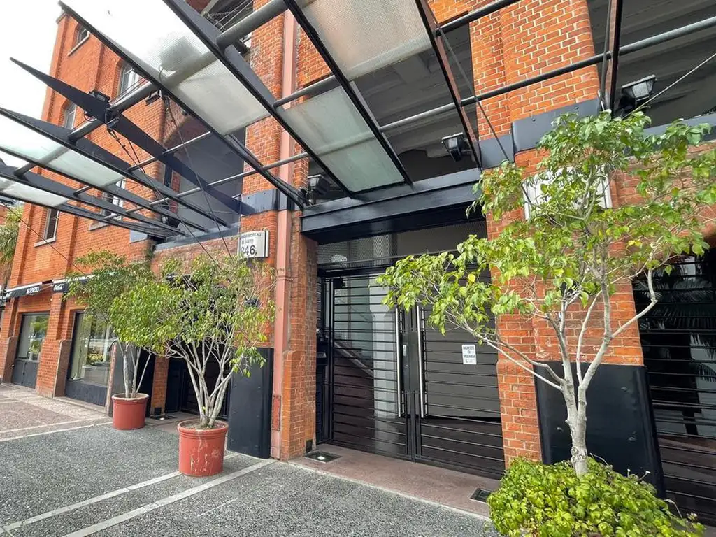 Impecable edificio estilo industrial. Edificio bien conservado con puerta de entrada y una segunda puerta de reja con cámaras.