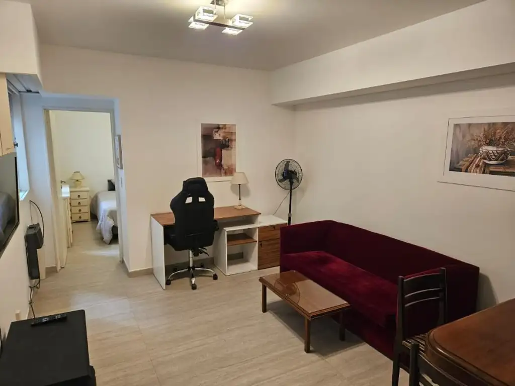 Al ingresar, se accede al living-comedor, que distribuye al resto de los ambientes. El espacio está equipado con mesa extensible y cinco sillas, sillón, rack de TV y escritorio con silla ergonómica (entre otras cosas).