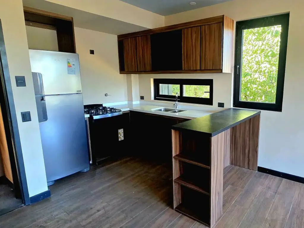 Departamento a estrenar de 82,2 m2 cubiertos y 27,7 m2 de jardín propio. Cuenta con dos dormitorios (uno en suite) con placar, 2 baños completos, living comedor con cocina integrada con isla desayunadora y cochera.