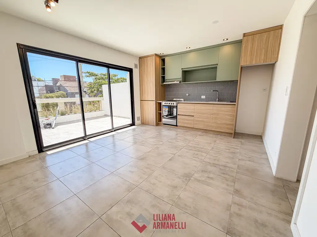 Departamento de 2 ambientes a estrenar. Amplio living comedor. Cocina con amoblamiento a medida. Terraza con parrilla. Placard en pasillo de distribución. Dormitorio al cfte. Baño completo con mampara. Calefacción por losa radiante. Caldera dual. Aberturas de aluminio DVH. Iluminación led. 58 mts. 15 mts descubiertos. Sin expensas.