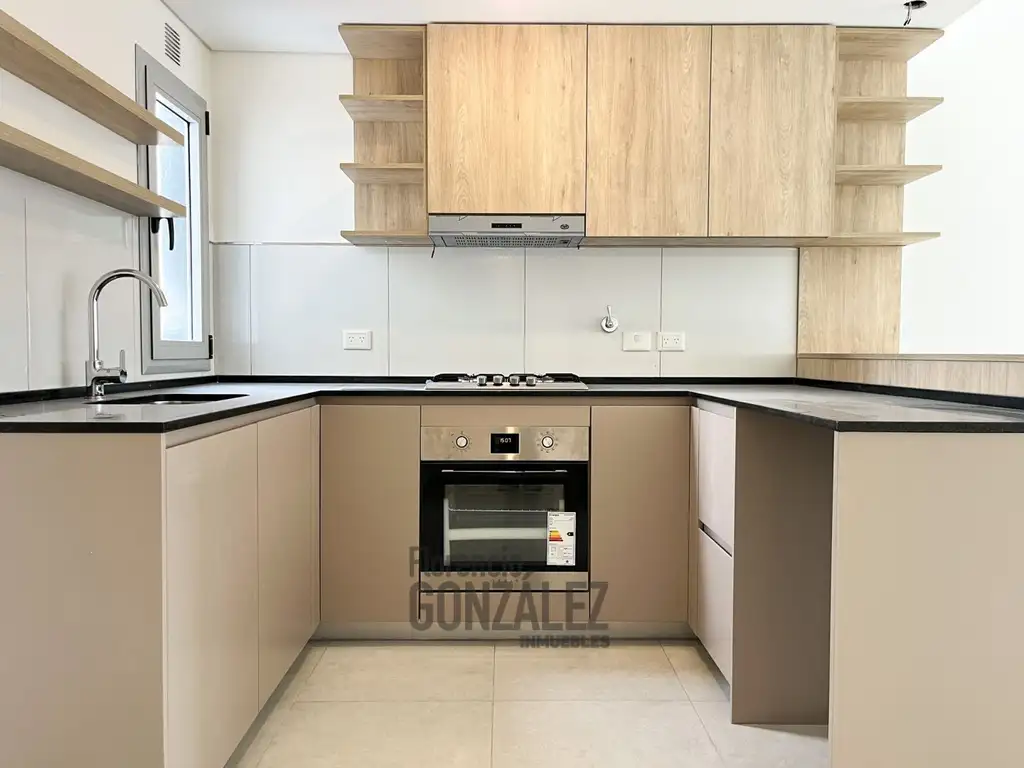 Al ingresar, hacia la izquierda, se encuentra la cocina con alacena, bajo mesada, cocina a gas y horno electrico. Está integrada al living-comedor, que tiene salida a un balcón corrido al frente con parrilla.