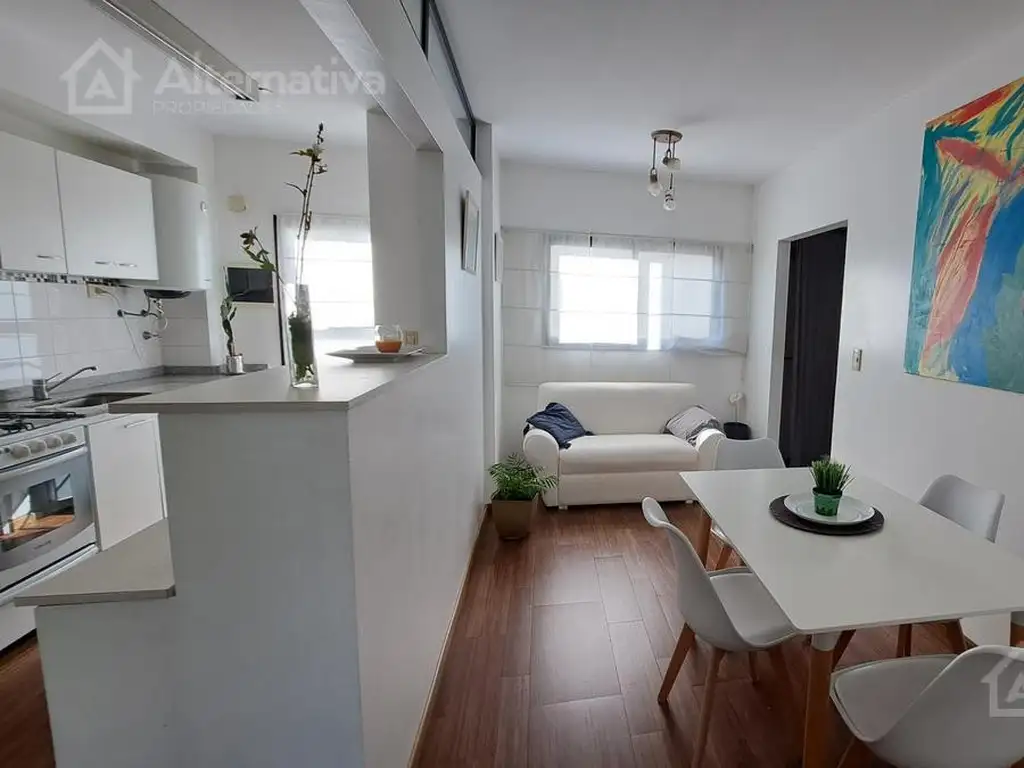 El living cuenta con un comodo sillón asi como juego de comedor de mesa y 4 sillas eames. éste se encuentra separado de la cocina por una barra desayunadora con dos sillas altas, cocina a gas, termotanque eléctrico, lavarropas, microondas, tostadora, cafetera y todos los utensillos necesarios para el dia a dia.
