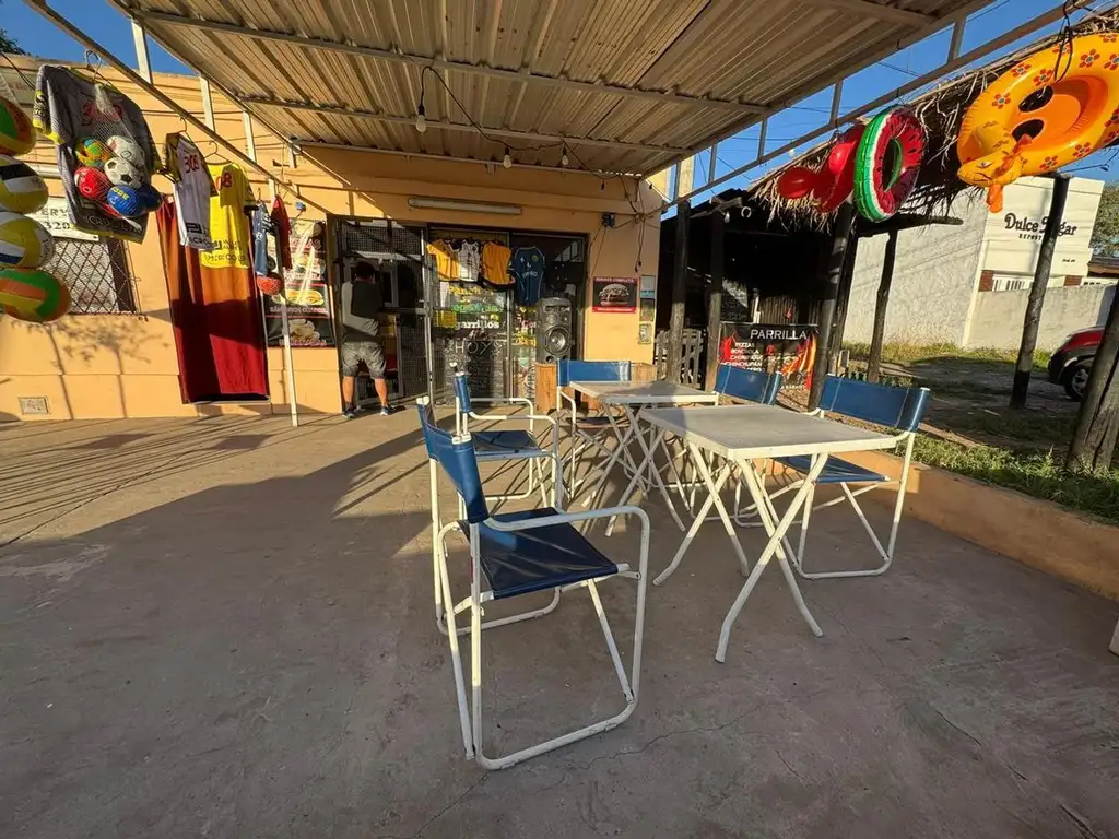 El negocio desarrolla actividades de kiosco, almacén, comidas rápidas y parrilla, contando con un espacio semicubierto al frente, ideal para atención al público y consumo en el lugar. Dispone de mesas y sillas exteriores, estructura de techo de chapa y sector preparado para gastronomía.