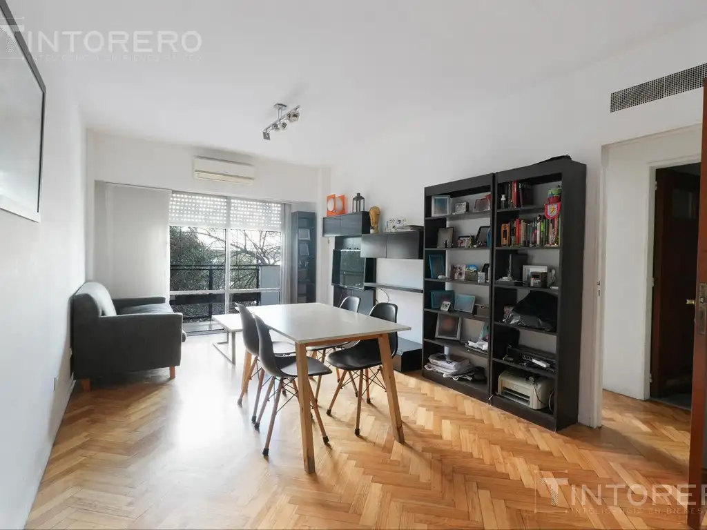 El living, amplio y luminoso, se integra con un balcón que ofrece doble salida, tanto desde esta área como desde uno de los dormitorios. La cocina es independiente, con muy buen espacio de guardado, y cuenta además con un pequeño lavadero separado. Los dormitorios poseen placards empotrados, el departamento incluye un baño completo más un toilette y se encuentra equipado con aire acondicionado frío/calor.
