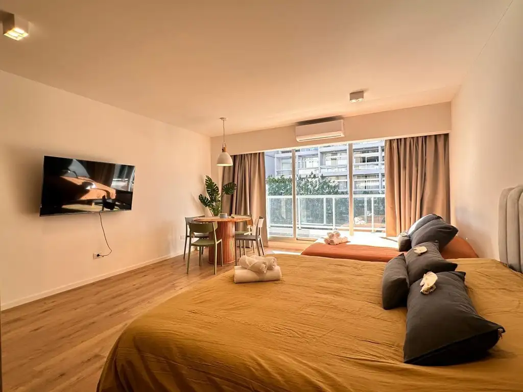 Amplio ambiente con salida a balcón con vista al frente. Aire acondicionado frio calor. Cortinas Black out.