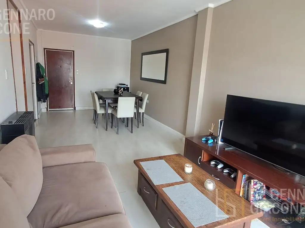 Al ingresar a la propiedad encontramos un amplio y luminoso living comedor con salida al balcón, por pasillo distribuidor encontramos sus 2 habitaciones con vista al frente con placares empotrados, cuenta con baño completo y ante baño con ventilación natural, su cocina con ventanas al contrafrente muy luminosa, cuenta con barra desayunadora, espacio para Lavarropas y Heladera