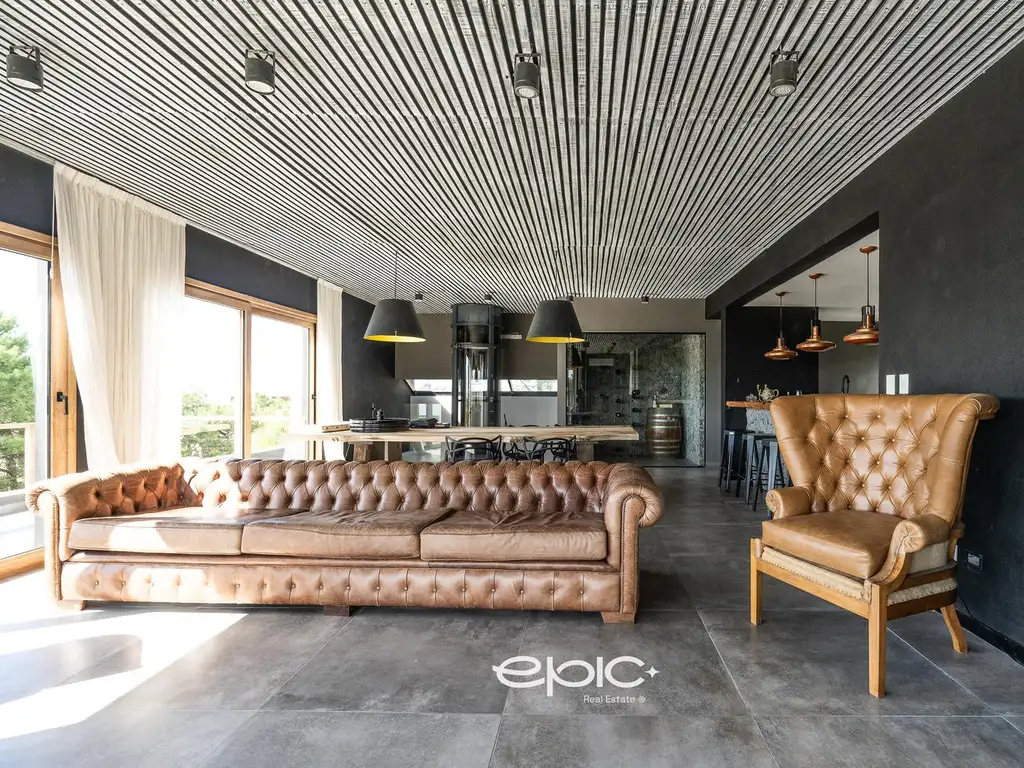 El segundo piso, destinado al área social, incluye un amplio living comedor con una gran abertura al frente, una cocina integrada por barra, una cava de vinos, un toilette y un balcón hacia el contrafrente.