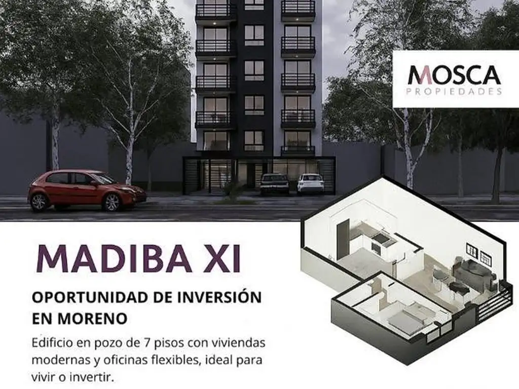 Madiba XI es un edificio residencial y comercial de 7 pisos, que combina viviendas modernas y oficinas flexibles, ideal para vivir, trabajar o invertir. Ubicado estratégicamente en Zeballos al 300, en el corazón de Moreno, a solo unas cuadras del centro y con fácil acceso a Acceso Oeste, centros comerciales y servicios.