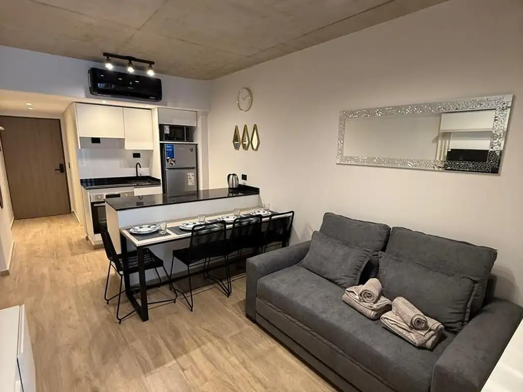 La unidad ofrece un ambiente luminoso con cocina integrada totalmente equipada (horno, anafe, microondas y heladera), barra desayunadora con espacio para cuatro personas y living con sofá confortable. El diseño de estilo industrial con detalles modernos y aire acondicionado garantiza una experiencia práctica y acogedora, perfecta tanto para trabajo remoto como para descanso.
