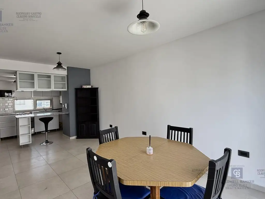 La cocina con conexión para lavavajillas o lavarropas se integra al ambiente mediante barra/desayunador, con mobiliario completo, mesadas de granito y muy buen espacio de guardado.