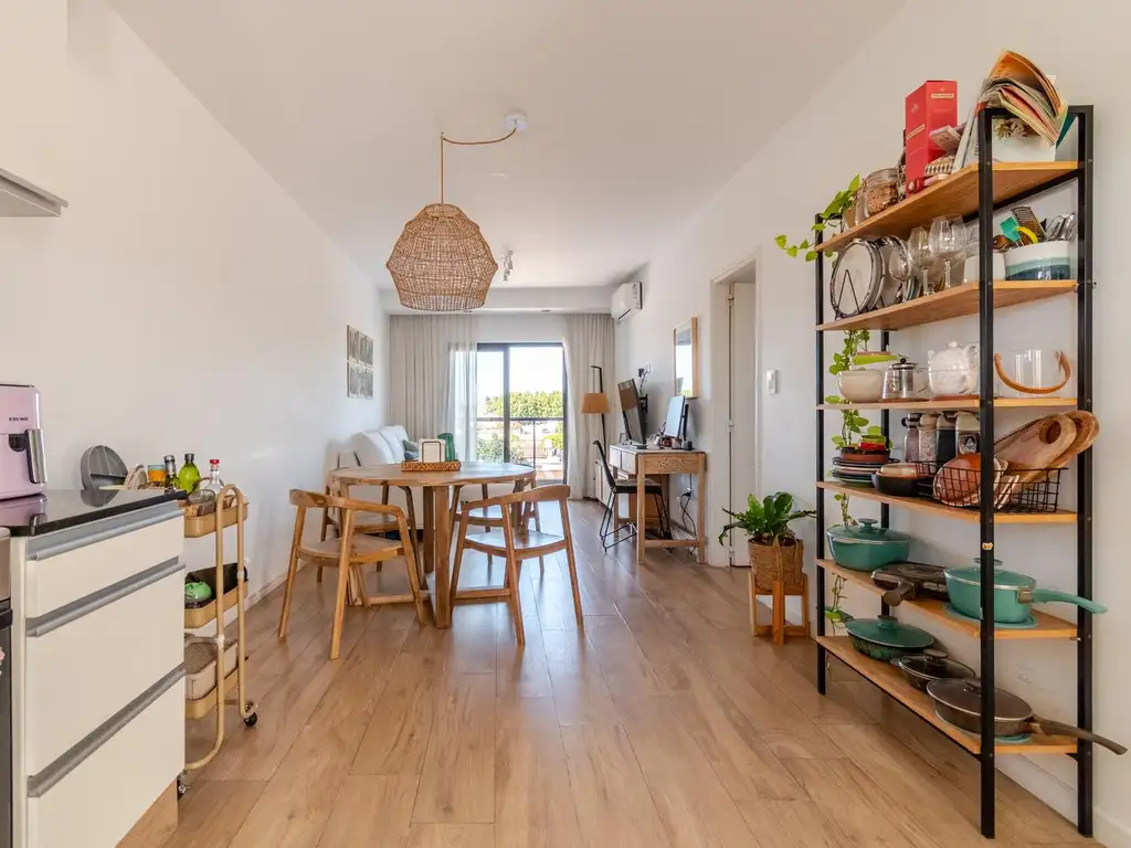 Al ingresar nos recibe un amplio living comedor con salida al balcón con parrilla. La cocina está integrada con buena cantidad de muebles bajo y sobre mesada, espacio para lavarropas. Toilette de visitas. Tiene dos dormitorios, el principal con salida al balcón. Baño completo.