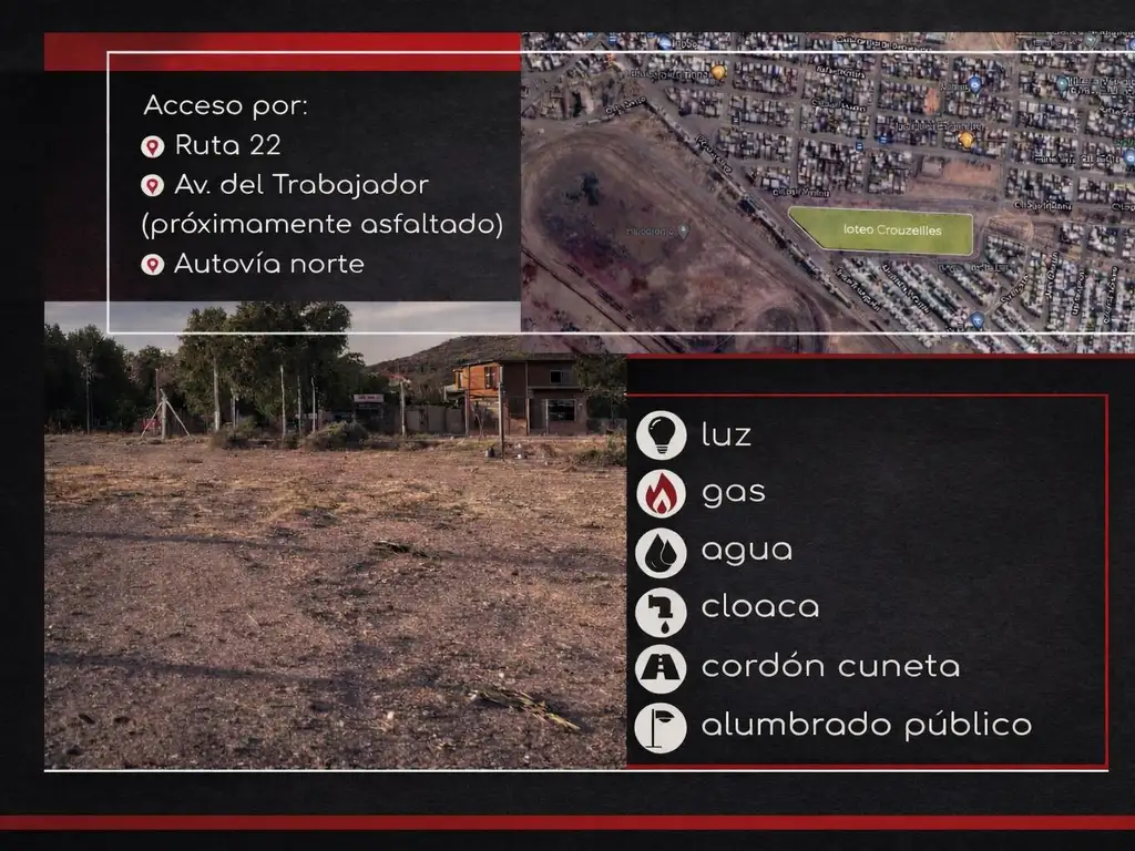 Descripción: Loteo Crouzeilles, está ubicado en el Noroeste de Neuquén, cuenta con planos aprobados, y con una excelente utilización de espacios el barrio quedará ubicado en un lugar con muchas circulación entre Plottier y Neuquén.