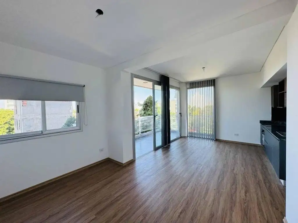 La propiedad cuenta con un amplio y luminoso living-comedor en excelente condiciones con ventanales corredizos muy luminosos que lo conectan con un balcón de amplias dimensiones, los ventanales cuentan con cortinas de bandas verticales, aire acondicionado, cocina completa (cocina integrada, amoblamiento bajo mesada y alacena), baño completo con bañera, todo con terminaciones de excelente calidad, dormitorio con ventanal muy luminoso y placard empotrado, el dormitorio cuenta también con aire acondicionado. El departamento cuenta con portero eléctrico.
