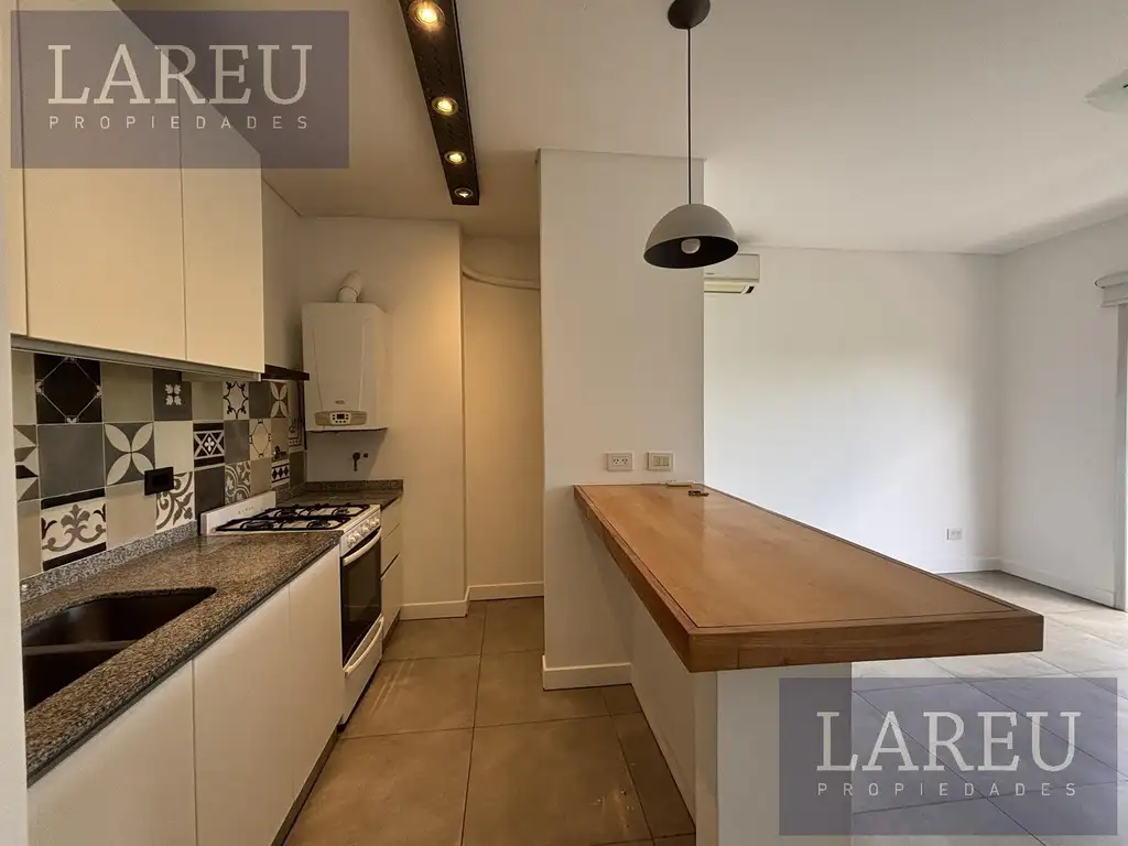 Cocina con barra desayunadora, living comedor con salida al balcón .
