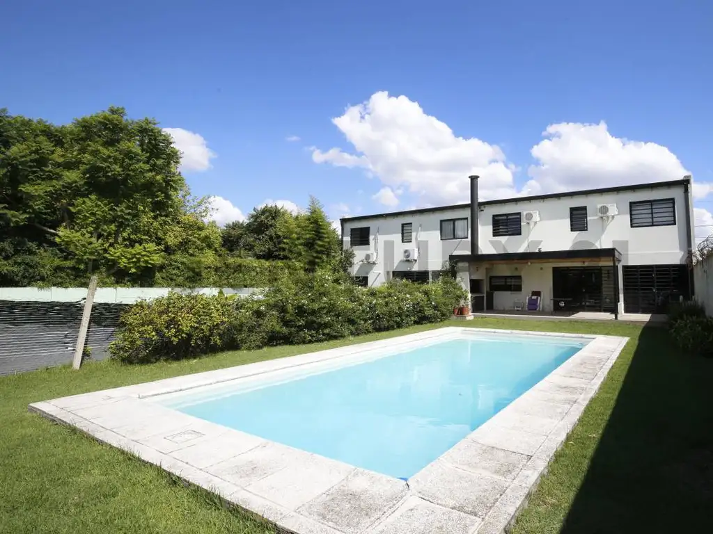 En el exterior se destaca la galería con parrilla y un amplio parque con piscina de 9 x 4 m, ideal para disfrutar al aire libre. Además, posee cochera cubierta para dos autos con portones automáticos.