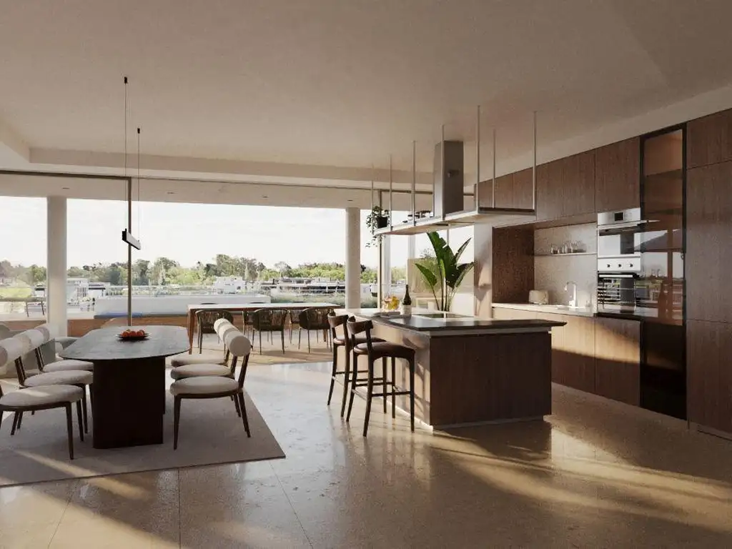 El espacio social se conecta a un balcón aterrazado con vistas abiertas al río, parrilla y pileta propia.
