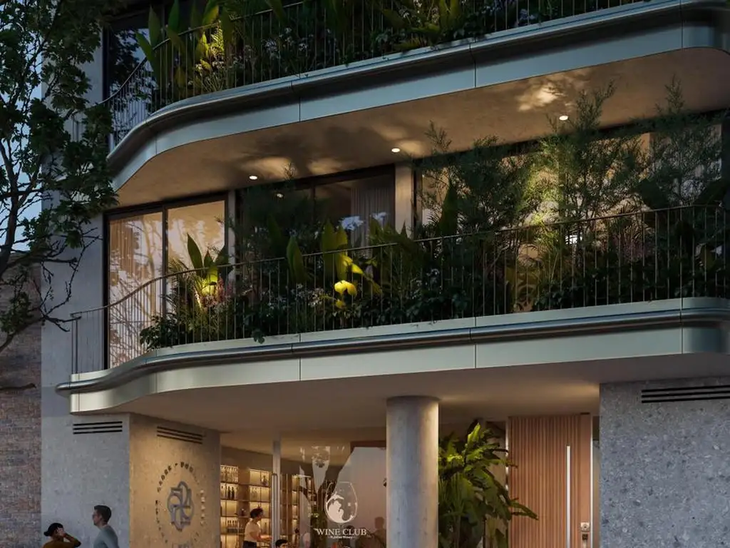La multitud de balcones que entran, salen y generan una fachada con movimiento. Rodeados por la vegetación de las veredas, se lucen los dos volúmenes que componen Donna Gioia.