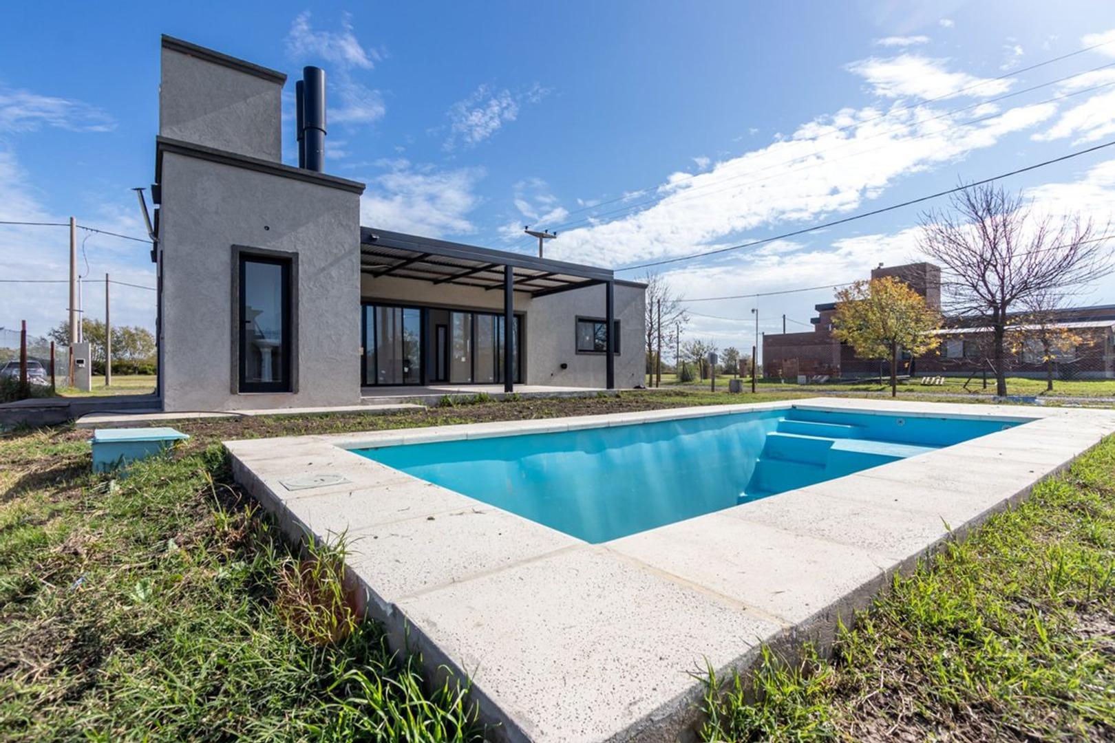 Se encuentra en pleno barrio cerrado \"Pucará de los Buhos\". El barrio cuenta con calles forestadas y con mejorado, servicio de agua, luz y gas natural y un altísimo nivel de crecimiento, conformando una de las comunidades con mayor desarrollo de la región. Casa de diseño a estrenar, sobre un terreno de 21 mts de frente por 39 mts de fondo, con una superficie total de 820m2. Dispone de un living-comedor amplio, una cocina semi-integrada, dos dormitorios, un baño completo. Galería con Parrillero. Jardín con pileta. Cochera semi cubierta con espacio para dos vehículos. Cuenta con una proyección de un tercer dormitorio en planta baja. 98m2 cubiertos. 2 cocheras semi cubiertas. Todos los servicios disponibles