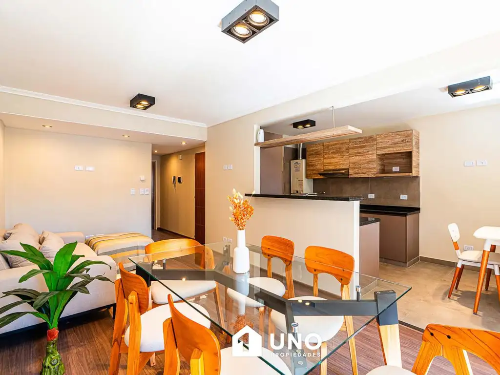 Semipiso a estrenar, orientado al norte con Ventilación Cruzada y doble ingreso. Acceso principal por estar/comedor de amplia superficie, además tiene salida a un gran balcón terraza con lavadero incluido. El segundo ingreso es por la cocina, esta se encuentra separada y está totalmente equipada, además cuenta con vista al frente, desayunador y comedor diario.