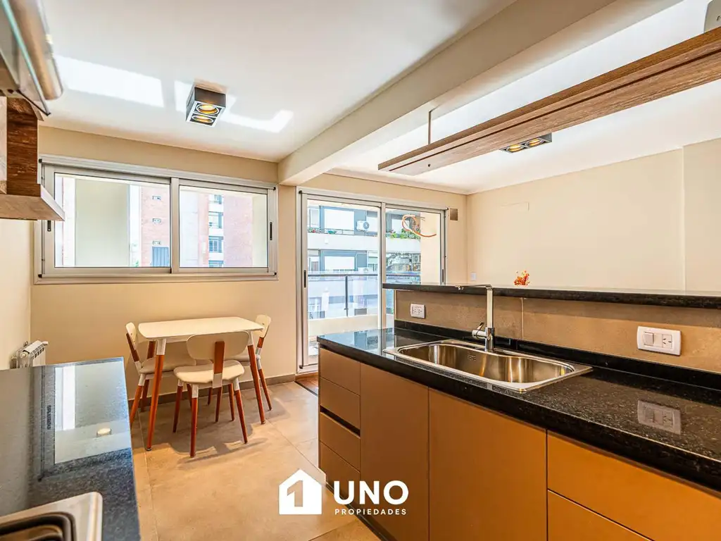 Semipiso a estrenar, orientado al norte con Ventilación Cruzada y doble ingreso. Acceso principal por estar/comedor de amplia superficie, además tiene salida a un gran balcón terraza con lavadero incluido. El segundo ingreso es por la cocina, esta se encuentra separada y está totalmente equipada, además cuenta con vista al frente, desayunador y comedor diario.