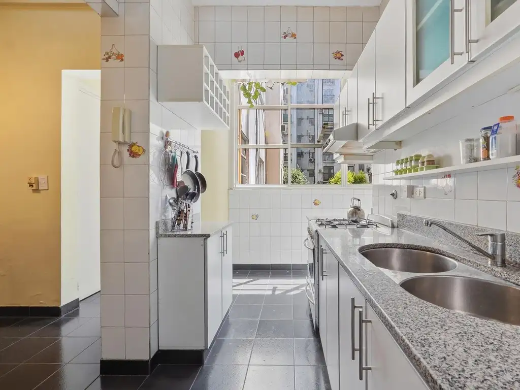El interior presenta elegantes pisos de parquet en las habitaciones y granito original en el living, reflejando el carácter distintivo de la época. El edificio se encuentra en óptimas condiciones, proporcionando servicios centrales que incluyen caldera y agua caliente central.
