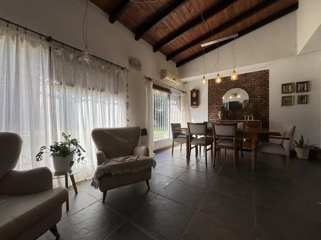 Descripción: Casa desarrollada en Planta Baja en increíble zona de la ciudad de Baigorria, con techos inclinados en combinación de losa y madera con exterior de chapa. Ingreso principal a living, comunicación a dos dormitorios, placares con interiores completos y piso de parquet de madera dura, Ambos con ventanas con rejas y vista al patio. Baño completo con bañera, vanitory con detalles en mármol, loza sanitaria y grifería de primera marca en buen estado, cerámicos blancos y ventilación natural. Cocina completa con alacenas y bajo mesada en madera, mesada de granito, anafe a gas con campana suspendida y horno elevado. Barra desayunadora hacia el comedor. Comedor amplio con grandes ventanales. Pisos de cerámico de alto tránsito en perfecto estado. Salida por puerta balcón en aluminio blanco hacia garaje y de allí al patio. Garaje con capacidad para dos autos y piso cerámico con baño de servicio y habitación de servicio en altillo. Salida a patio con quincho en espacio semicubierto, techo en madera y chapa, mesada de granito, parrillero y lavatorio. Patio arbolado de generosas dimensiones. Agua caliente por termo tanque a gas, dos calefactores instalados y 3 equipos Split de AA. Superficie de Terreno: 936 m2 con 26 metros por 36 metros.