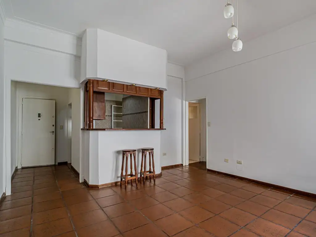 El living comedor tiene piso de baldosa colonial y se conecta con la cocina a través de una barra de madera con banquetas, que le da una buena integración visual sin perder la independencia de la cocina. La cocina cuenta con muebles de madera maciza, mesada de granito, bacha de acero inoxidable y campana extractora. El dormitorio principal tiene placar y piso de parqué; el segundo dormitorio también tiene piso de parqué. Tanto el living comedor como el dormitorio principal tienen ventanas con persianas que dan a uno de los jardines internos del complejo, lo que aporta luz natural y una vista verde poco habitual. El lavadero es independiente y está separado de la cocina. Calefacción por tiro balanceado.