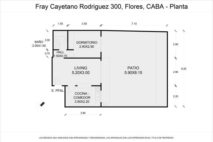 Living comedor, cocina separada, habitación con placard, baño completo y patio de 57m2.