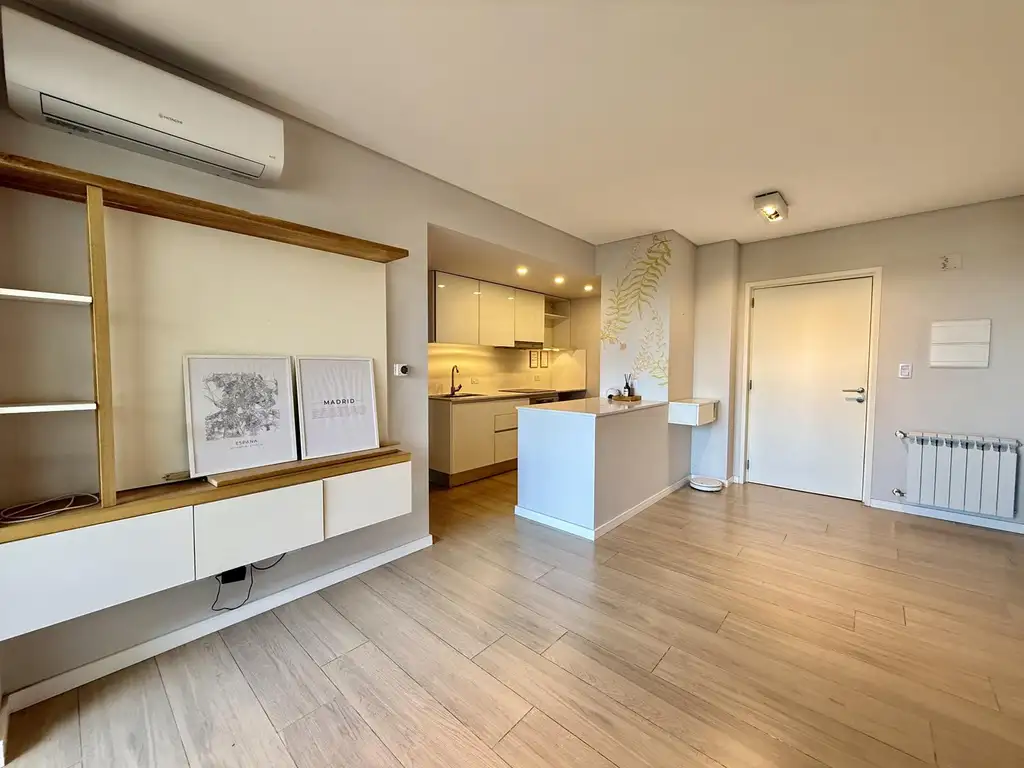 La unidad se compone de un living comedor equipado con aire acondicionado instalado, luminarias y rack para TV, con salida a balcón con vista despejada. Las aberturas son de aluminio de alta prestación e incluyen tejidos mosquiteros y cortinas black out.