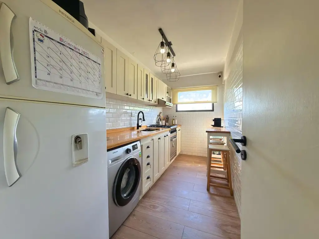 El ingreso nos recibe con un living comedor de grandes dimensiones, con pisos flotantes y un gran ventanal que brinda excelente luminosidad y salida directa a un balcón corrido al frente, completamente independiente, ideal para disfrutar del exterior. La cocina, totalmente separada y refaccionada a nuevo, se presenta moderna y muy bien equipada, con mueble bajo y alto mesada de amplio espacio de guardado, artefacto de cocina a gas tipo industrial, conexión para lavarropas, espacio para heladera y ventana al frente, lo que garantiza ventilación y luz natural.