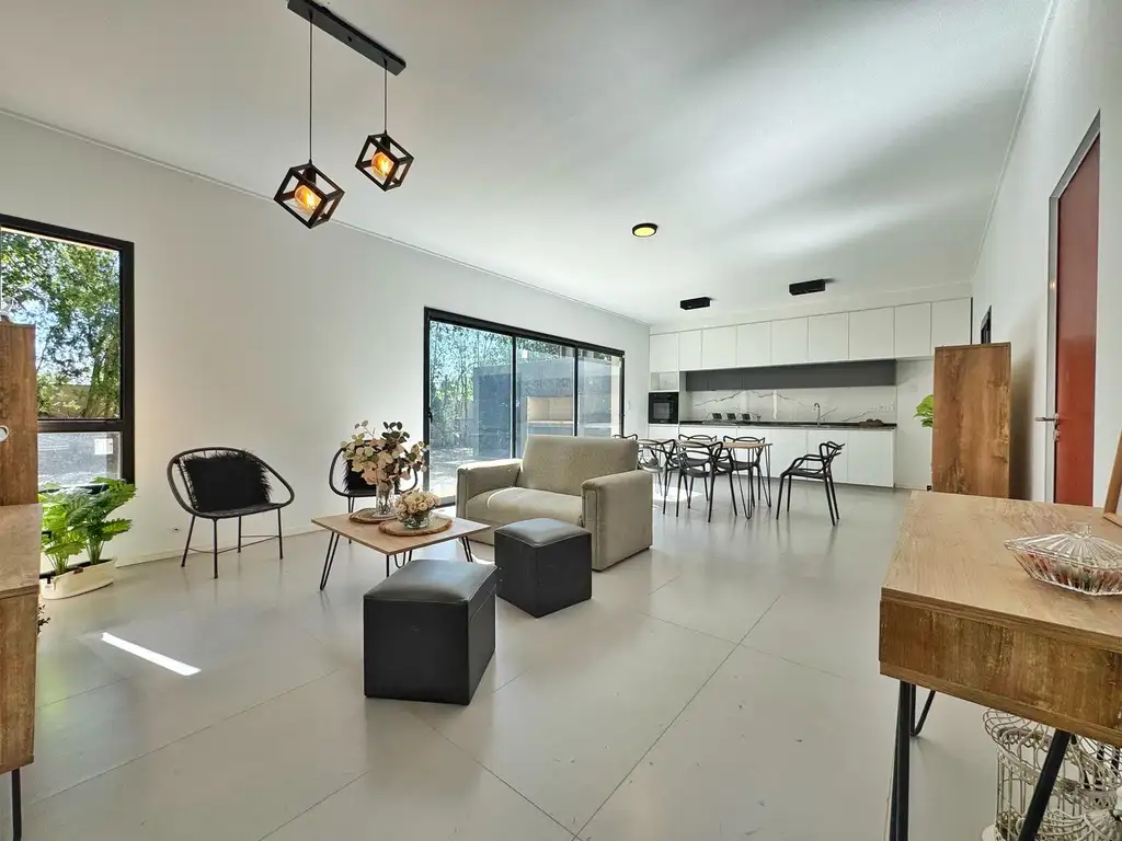Amplio living comedor, cocina integrada y equipada con muebles de alacenas y bajo mesadas, y mesada de mármol.