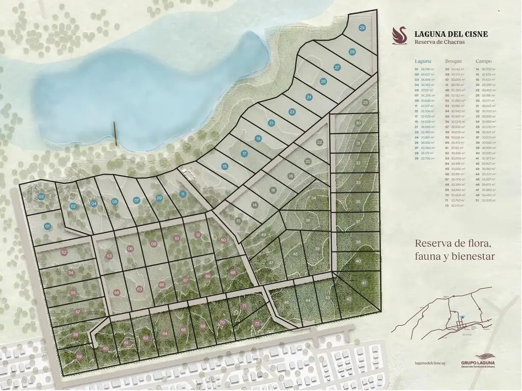 Exclusiva chacra de 36.627 metros cuadrados ubicada dentro del emprendimiento Laguna del Cisne, con privilegiada vista abierta hacia la laguna y entorno natural protegido. Su superficie permite desarrollar una residencia principal con amplios espacios exteriores, manteniendo privacidad y escala campestre real.