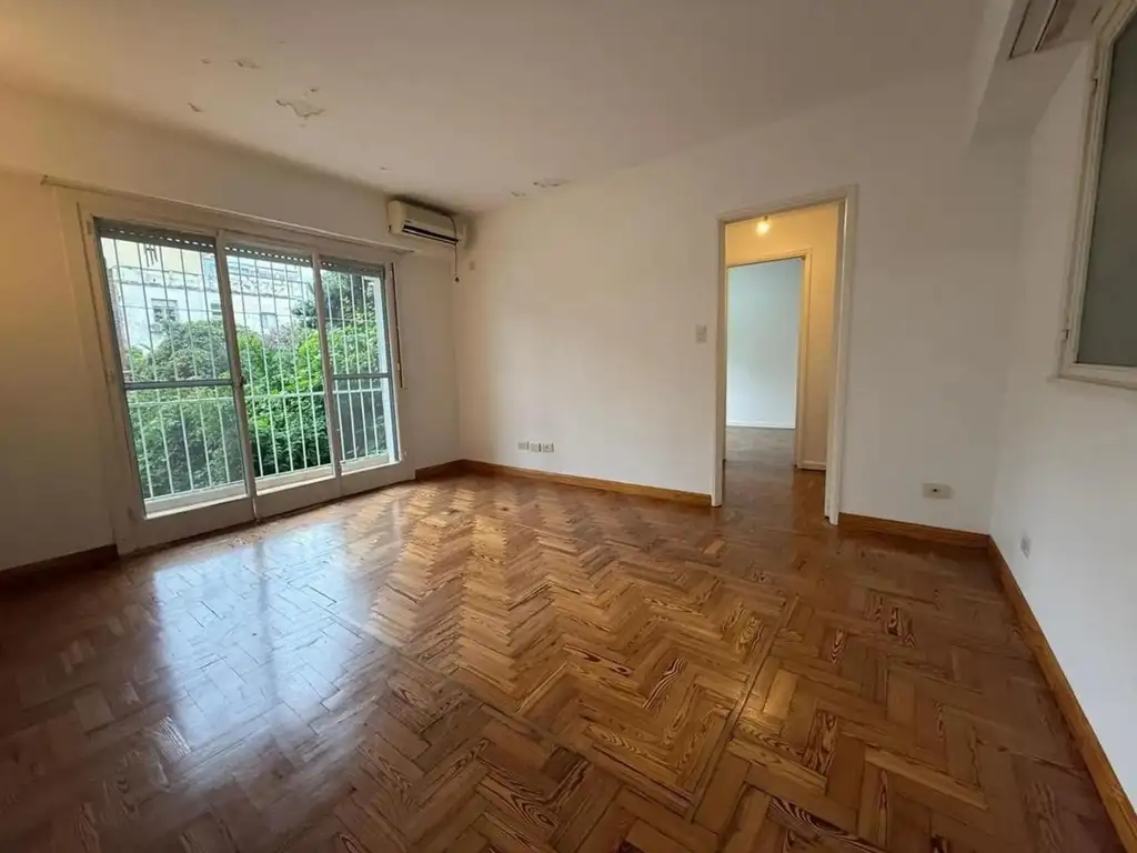 El departamento cuenta con un hall recibidor, living comedor amplio y luminoso, con pisos de parquet plastificados y salida a un balcón corrido con vista verde. Cocina independiente con alacenas, bajo mesada, artefacto de cocina a gas y lavadero incorporado. cuenta con un dormitorio principal con placard y aire acondicionado instalado y un segundo dormitorio con placard empotrado en la pared. Baño completo en buen estado