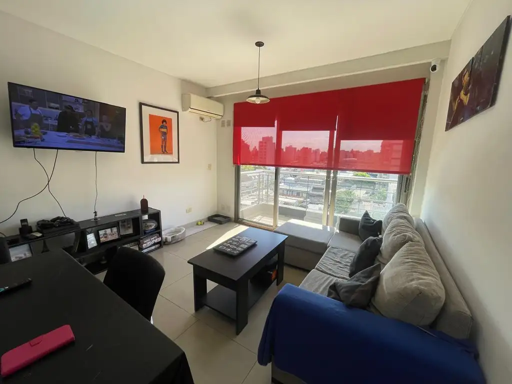 El departamento cuenta con una cocina integrada equipada con una barra desayunadora que se abre hacia un amplio y luminoso living-comedor. Un gran ventanal ilumina el espacio y proporciona acceso al balcón, ideal para disfrutar de las vistas y el aire fresco. El dormitorio, con placard incorporado, también conecta al balcón corrido, asegurando una excelente luz natural y ventilación. Un baño completo complementa los espacios interiores.